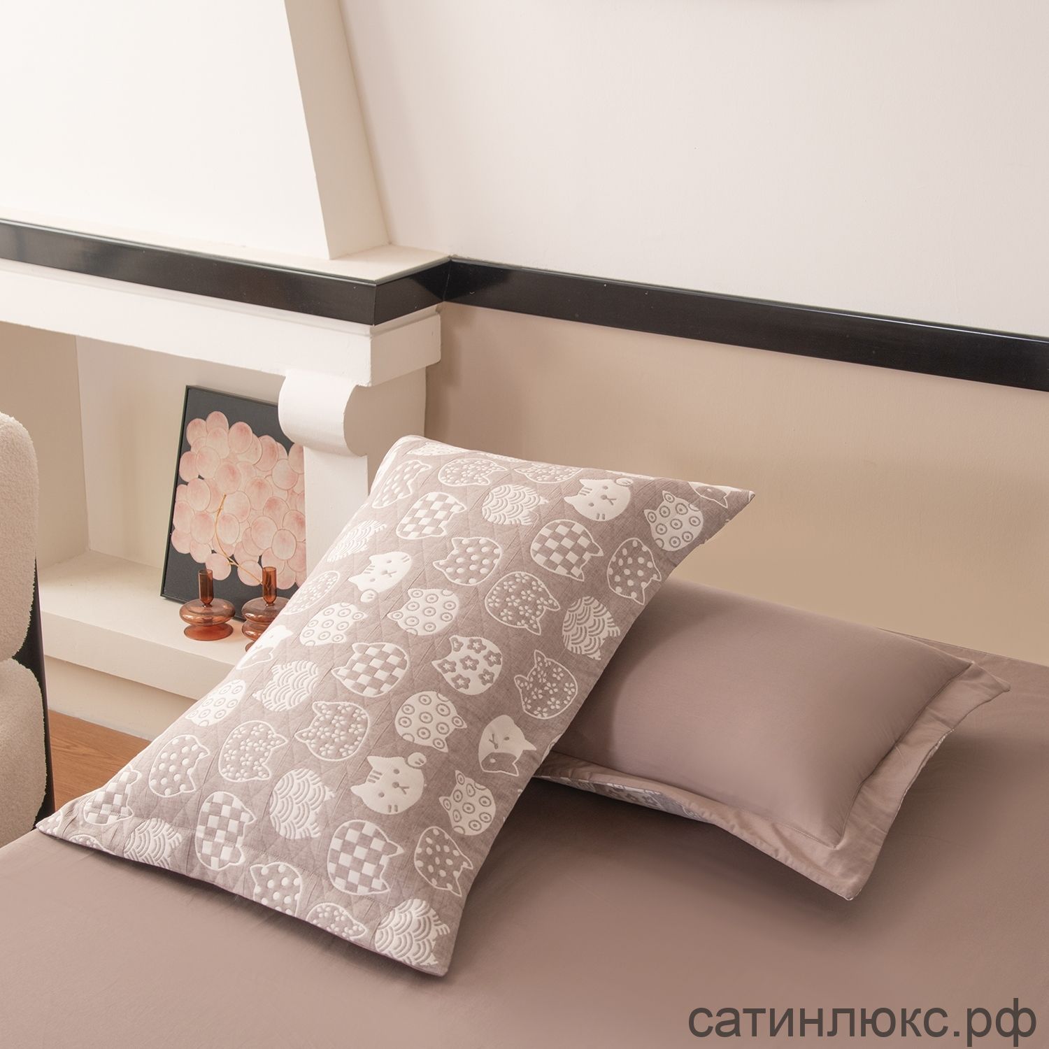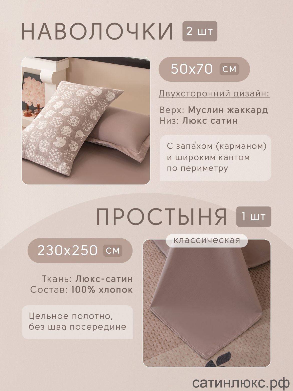 В комплект также входят однотонная простыня из люкс-сатина и две двусторонние наволочки с широким кантом по периметру. Одна сторона наволочек выполнена из жаккардового муслина с тем же изящным узором, что и покрывало, другая - из гладкого люкс-сатина, что даёт возможность комбинировать и создавать новые вариации оформления постели.