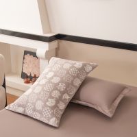 Покрывало выполнено из жаккардового муслина с декоративной простёжкой, формирующей утончённый рельефный узор. Ткань отличается мягкостью, лёгким благородным блеском и изысканной текстурой. Завершает композицию широкий кант в тон простыни, который визуально объединяет все элементы комплекта и придаёт образу гармоничную завершённость.