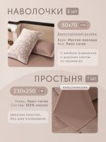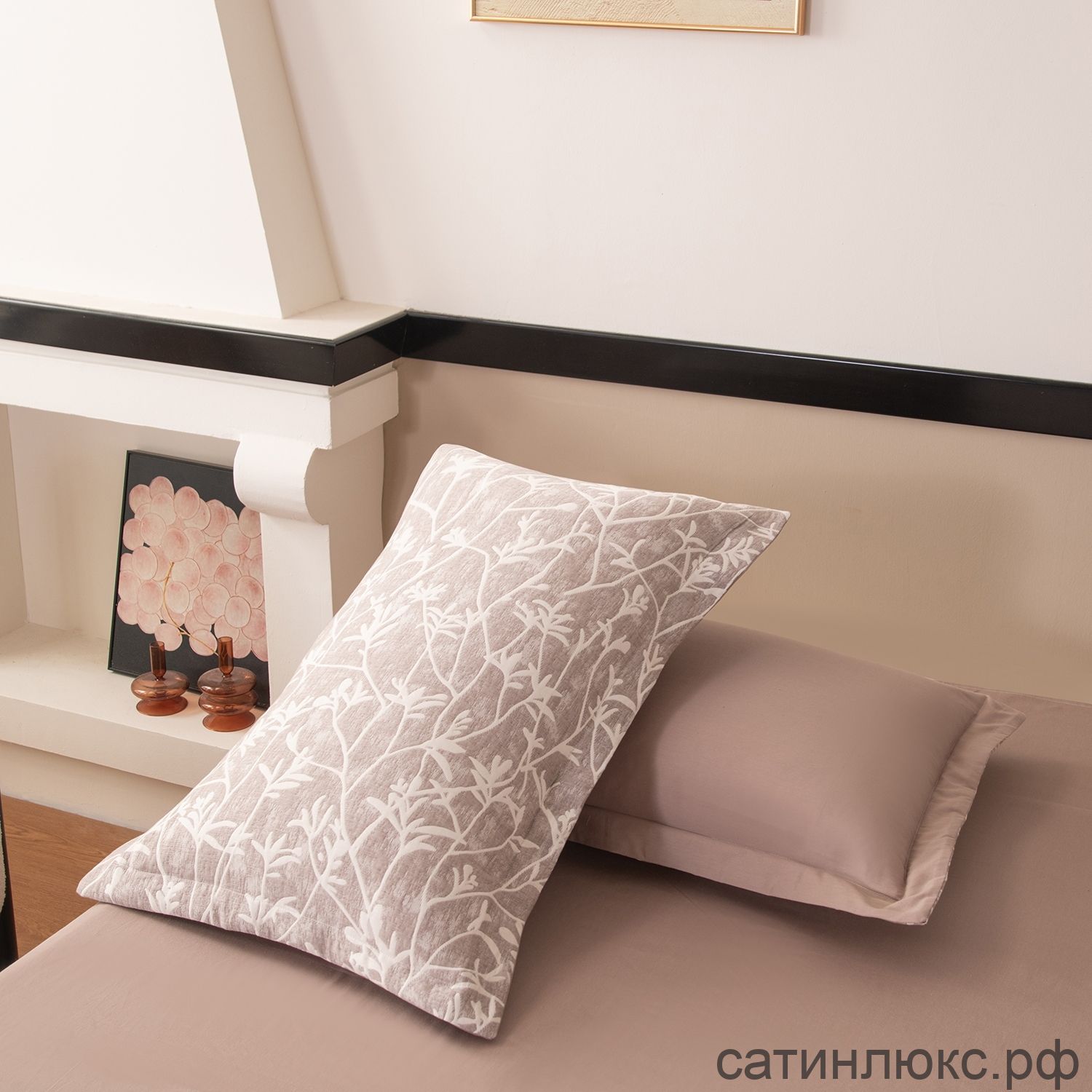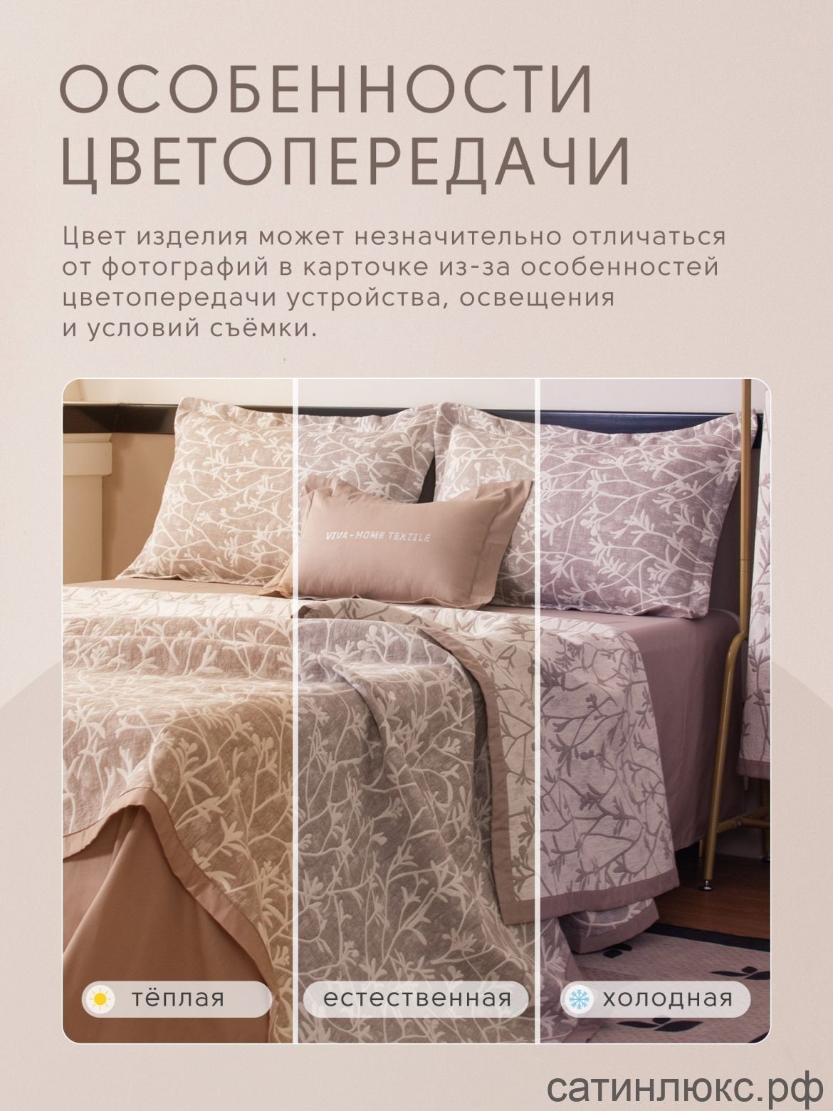 В комплект также входят однотонная простыня из люкс-сатина и две двусторонние наволочки с широким кантом по периметру. Одна сторона наволочек выполнена из жаккардового муслина с тем же изящным узором, что и покрывало, другая - из гладкого люкс-сатина, что даёт возможность комбинировать и создавать новые вариации оформления постели.