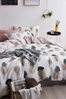 Пододеяльник (на молнии) и наволочки (с запахом/кармашком) украшены кантом по периметру.