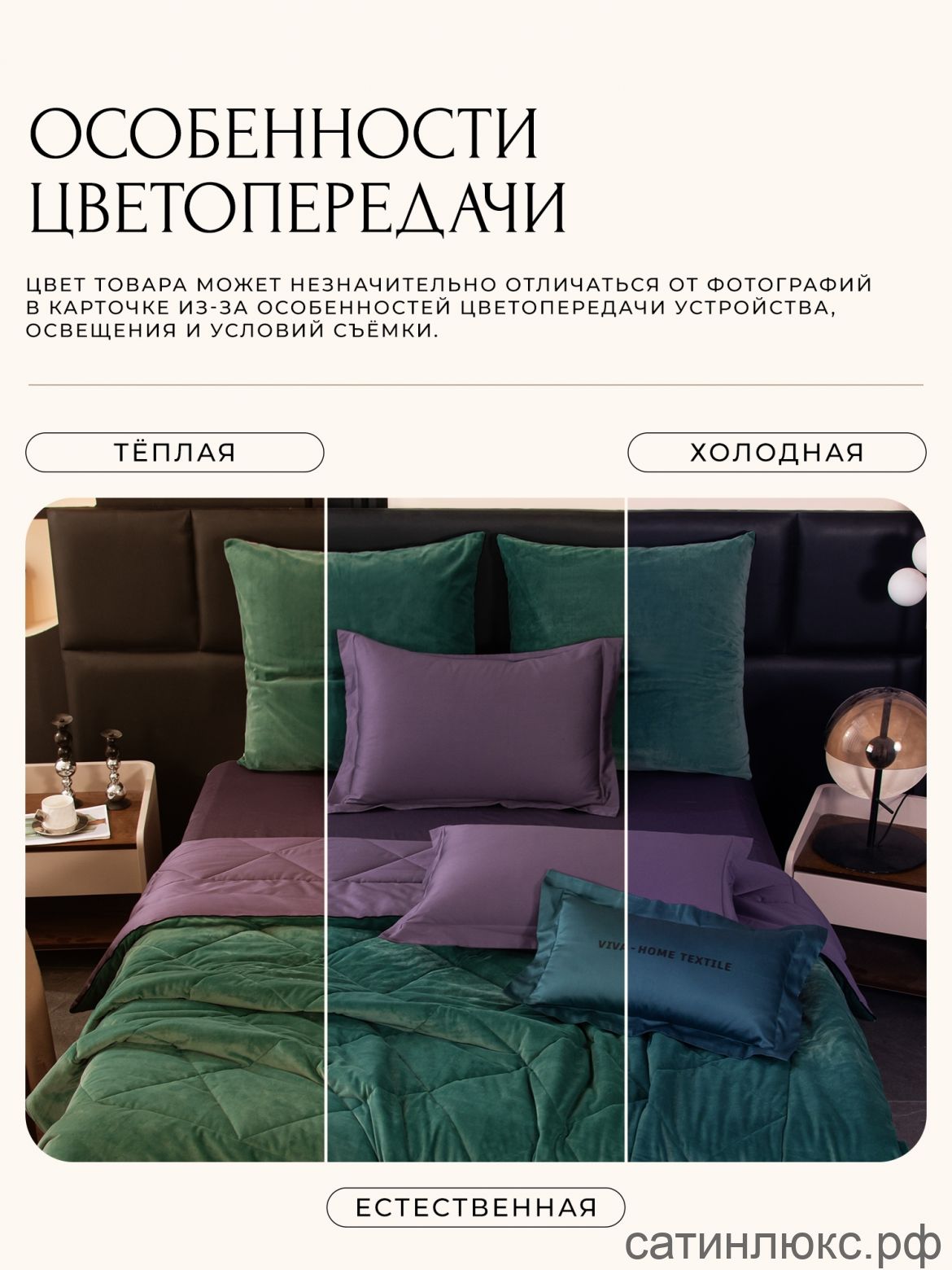 Особенность комплекта - наличие стёганого одеяла-покрывала, полностью готового к использованию. Вам не понадобится пододеяльник: одеяло сразу идёт в комплекте и идеально сочетается с постельным бельём, что делает уход за ним максимально удобным.