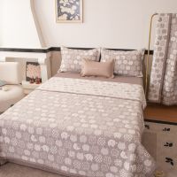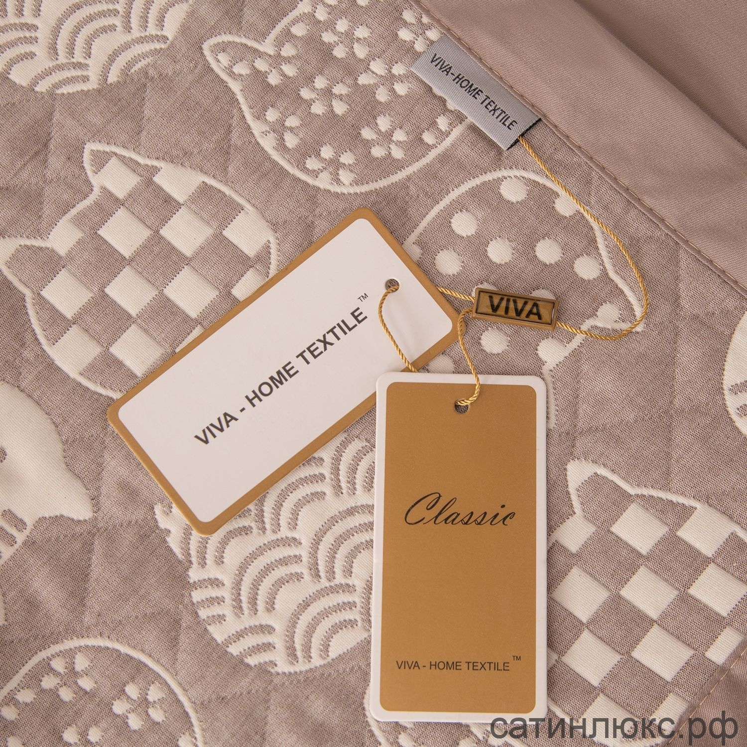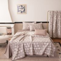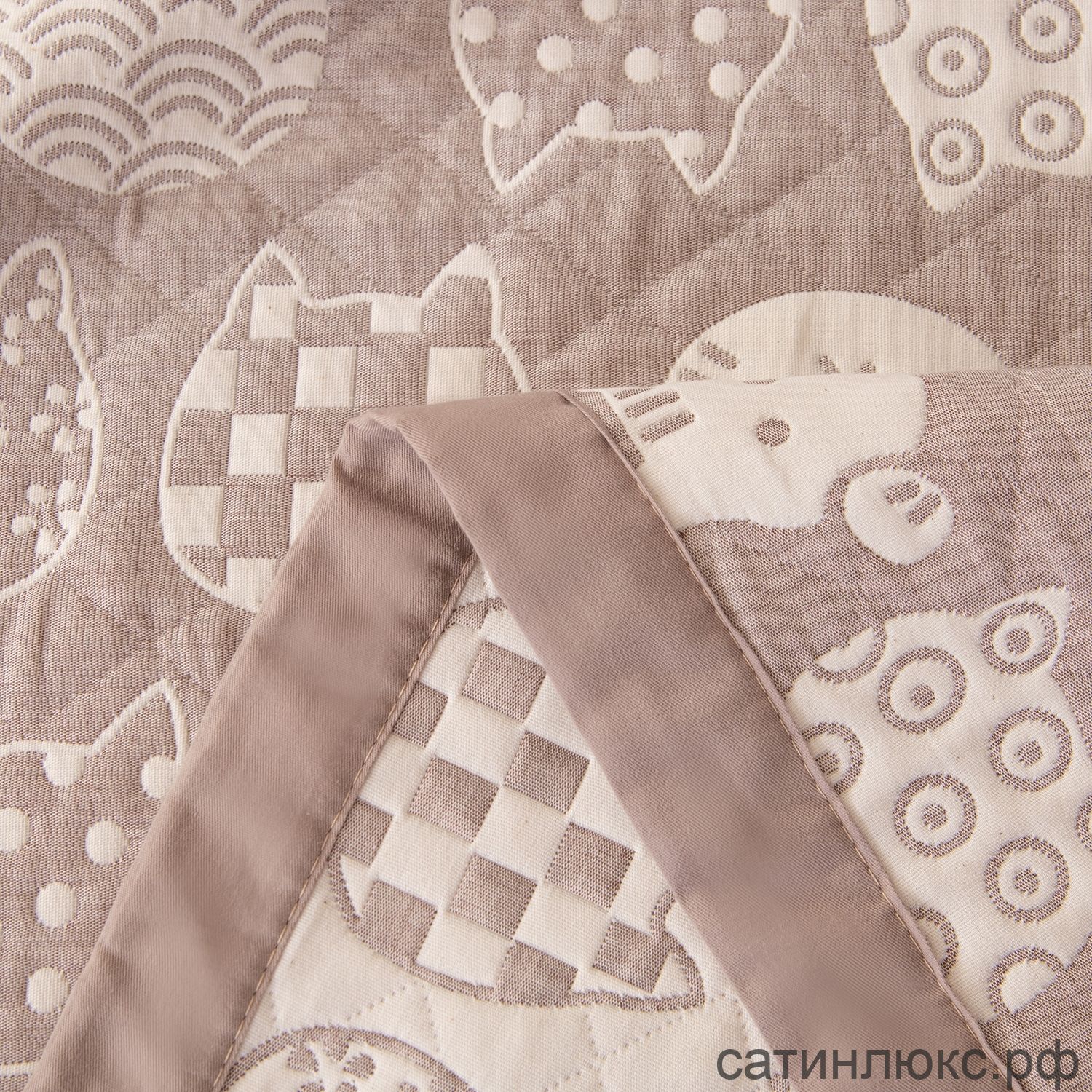 Покрывало выполнено из жаккардового муслина с декоративной простёжкой, формирующей утончённый рельефный узор. Ткань отличается мягкостью, лёгким благородным блеском и изысканной текстурой. Завершает композицию широкий кант, придающий изделию гармоничную завершённость.