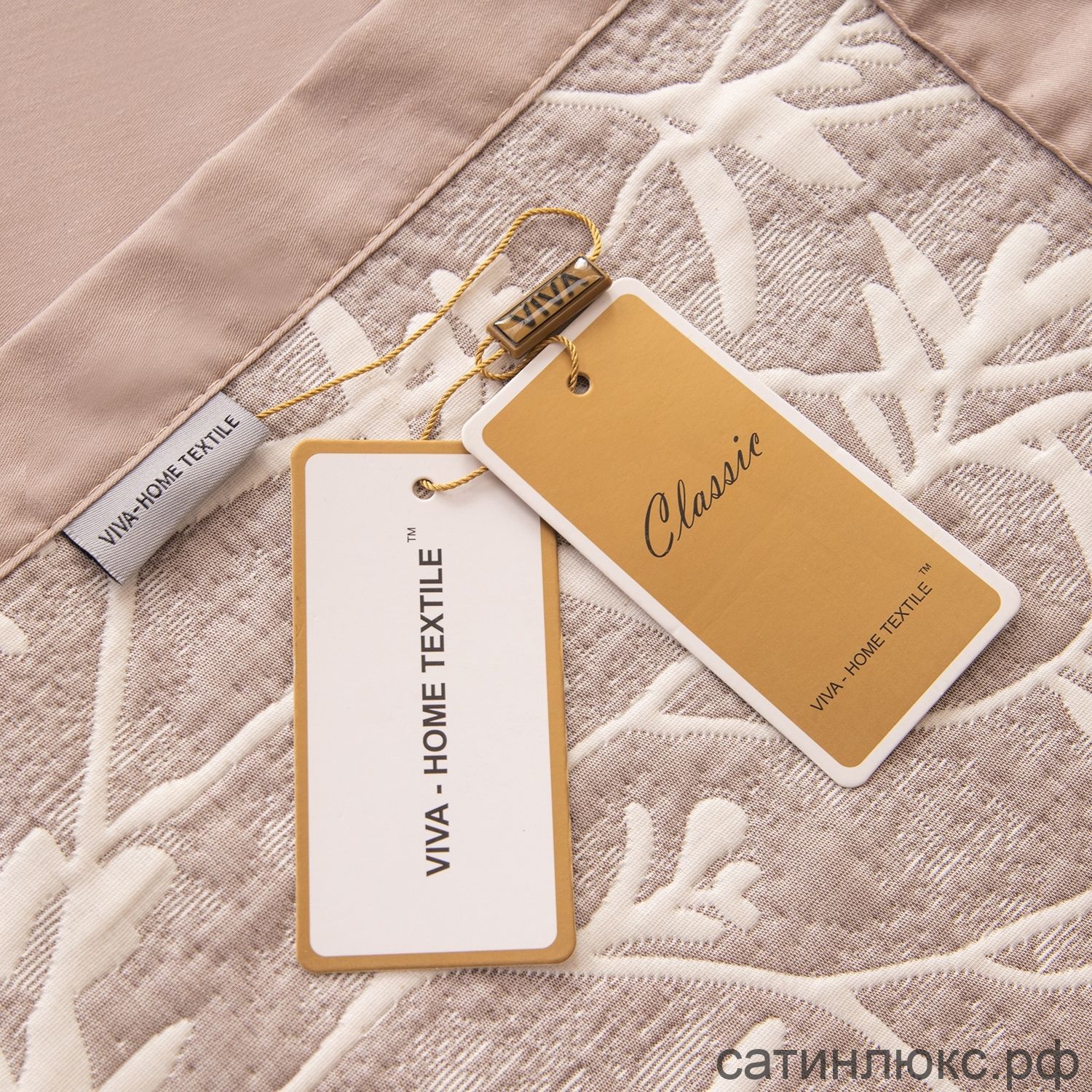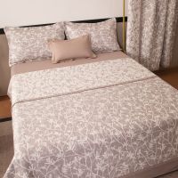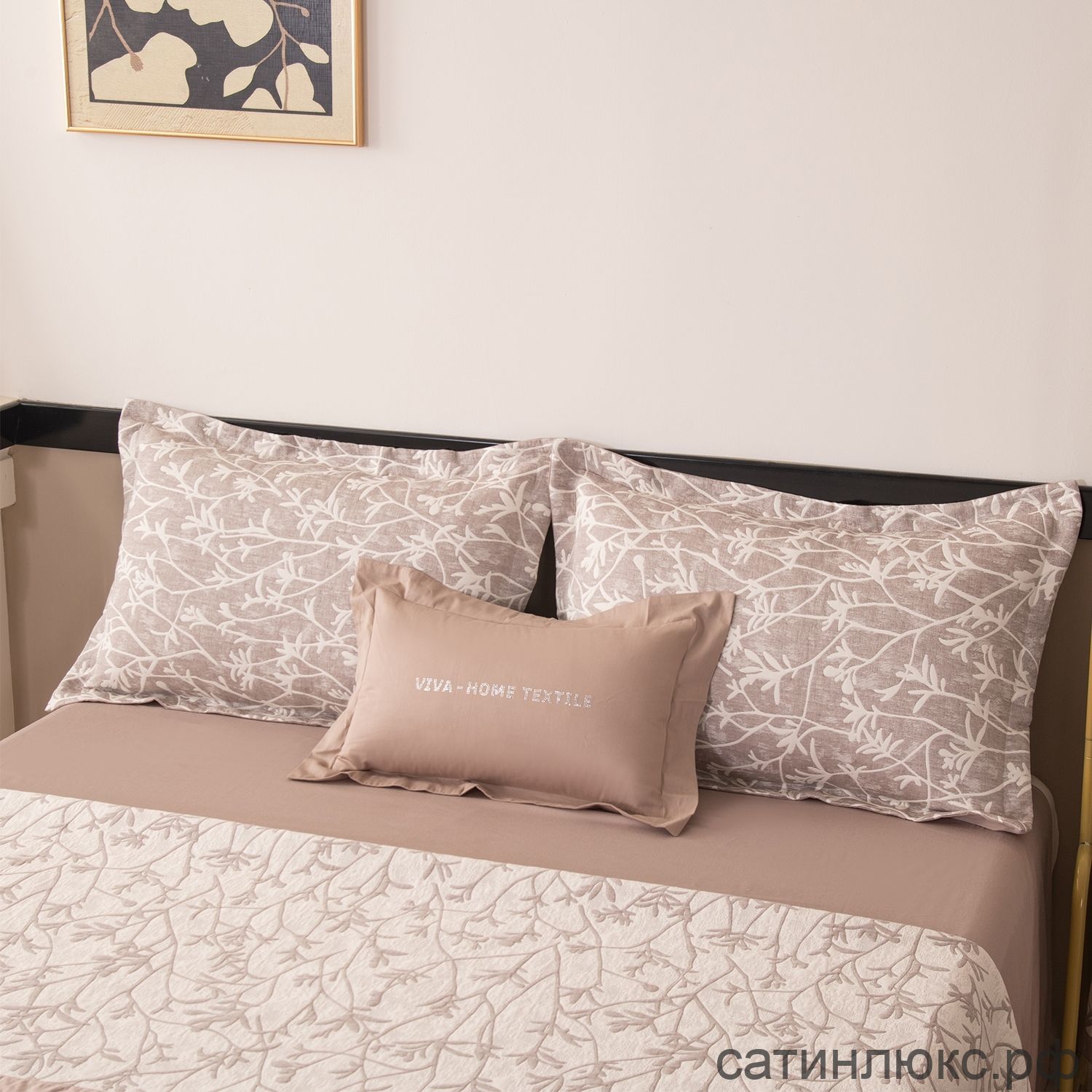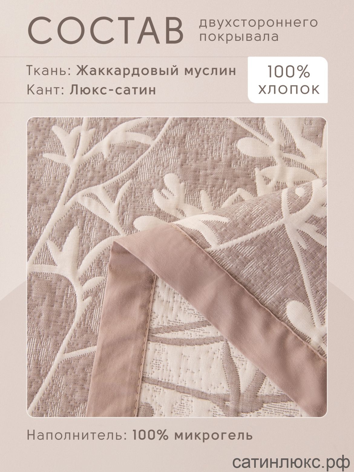 Покрывало выполнено из жаккардового муслина с декоративной простёжкой, формирующей утончённый рельефный узор. Ткань отличается мягкостью, лёгким благородным блеском и изысканной текстурой. Завершает композицию широкий кант, придающий изделию гармоничную завершённость.